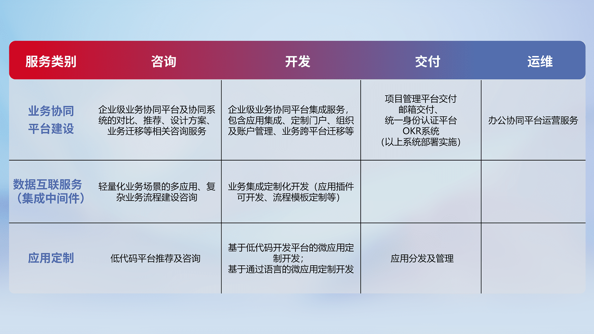 针对钉钉、、、、企微、、、IDaas等平台级产品提供产品的规划、、方案、、、交付、、定制化开发等服务,,,,实现如统一协同办公、、、智能客户服务、、混合会议管理、、、智能数据查询、、、、等业务场景,,实现数字化转型。。。。
